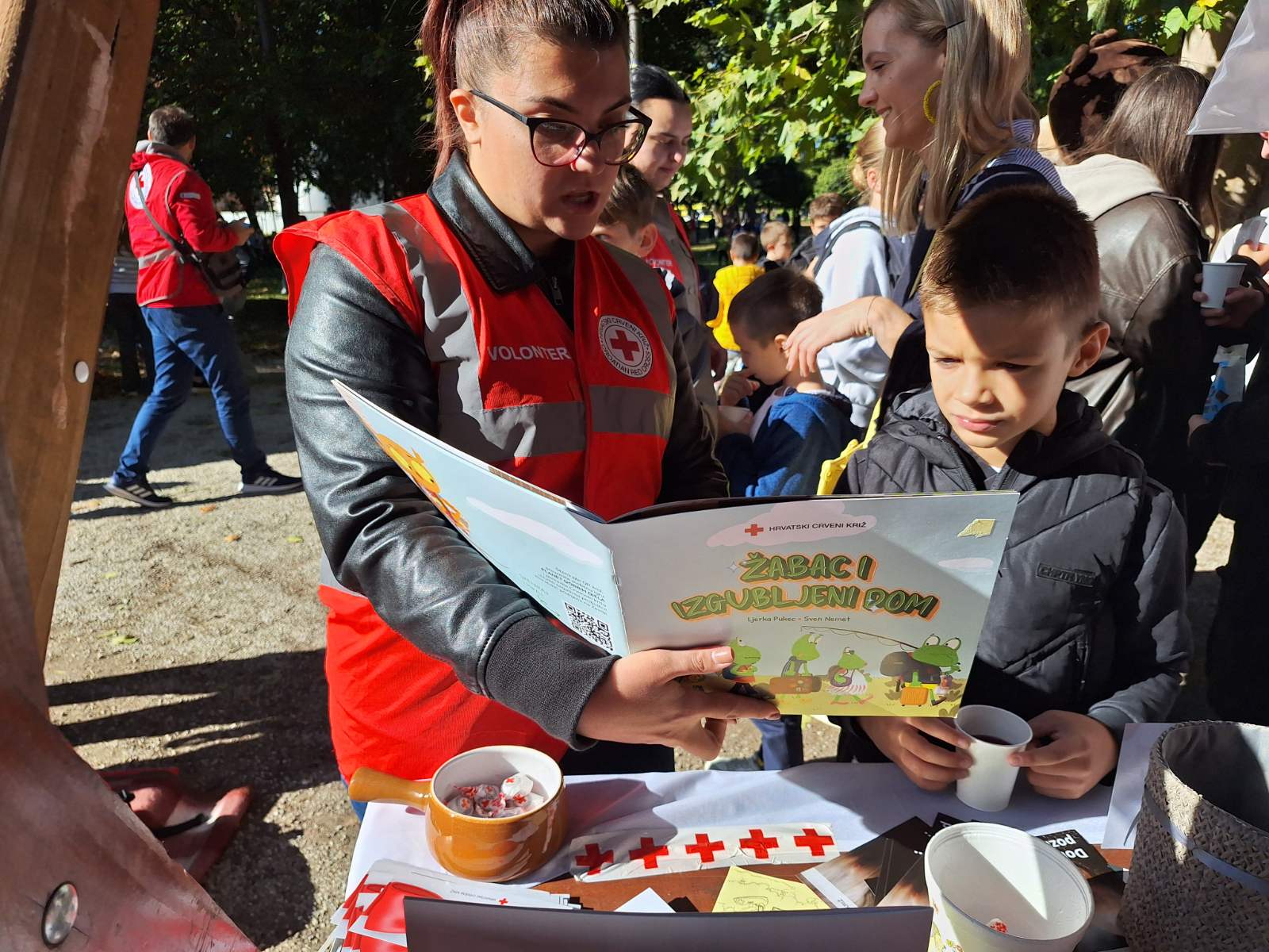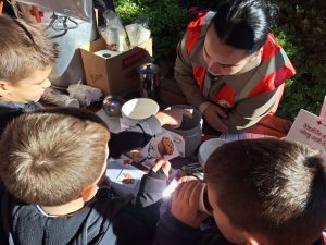 Naše volonterke djecu su kroz igru upoznale s važnosti doniranja hrane u svrhu smanjenja bacanja hrane te brige za okoliš. Mnogima je pažnju privukla slikovnica „Žabac i izgubljeni dom“ te su kroz priču shvatili koliki utjecaj na okoliš ima čovjek. Uz aktivnosti kojima smo djeci približili djelatnosti Crvenog križa, volonterke su dijelile topli čaj, a smijeha i radosti bio je pun gradski park.