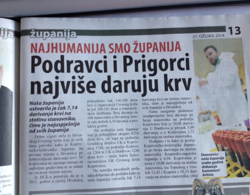 KOPRIVNICA -Hrvatski Crveni križa objavio je izvješćše o dobrovoljnom darivanju krvi za cijelu Hrvatsku. U 2013. godini u cijeloj Hrvatskoj prikupljeno je 146.200 doza krvi u […]
