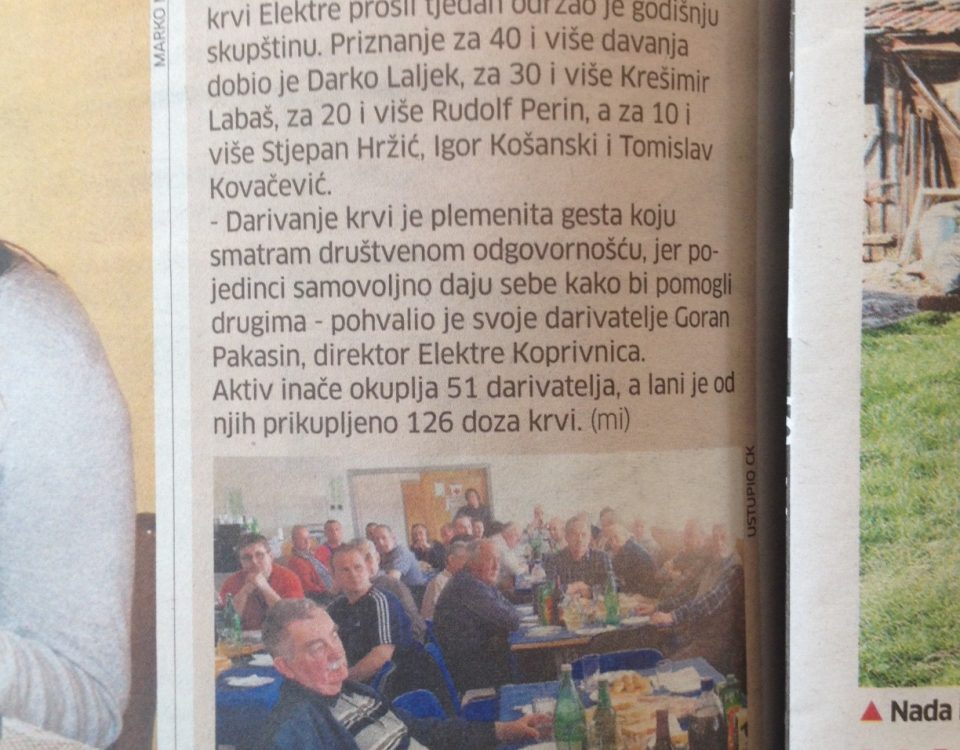 KOPRIVNICA – Aktiv dobrovoljnih darivatelja krvi Elektre održalo je redovnu skupštinu u sjedištu koprivničke tvrtke. Darko Fajdić, predsjednik Aktiva i njegovi suradnici Željko Ivačić i Martina […]
