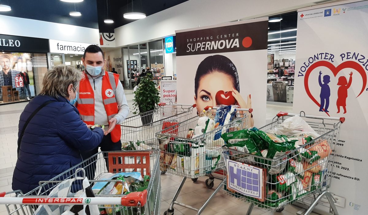 Akcija je provedena uz poštivanje svih epidemioloških mjera i preporuka za zaštitu od širenja koronavirusa. Naknadno možete donijeti svoje donacije u prostore Gradskog društva Crvenog križa Koprivnica u Ulici braće Radića 7. U ovoj akciji prikupljanja donacija za Socijalnu samoposlugu sudjelovali su volonteri koji su uključeni u projekt ‘Volonter penzioner’. Pozivamo sve umirovljenike koji žele sudjelovati u aktivnostima projekta ‘Volonter penzioner’ da se jave na broj 048/642-193. Projekt ‘Volonter penzioner’ sufinanciran je bespovratnim sredstvima iz Europskog socijalnog fonda (ESF) – Operativnog programa Učinkoviti ljudski potencijali 2014-2020. u iznosu od 1.984.964,46 kuna, a provodi se od 19. listopada 2020. godine. Nositelj projekta je Gradsko društvo Crvenog križa Koprivnica, a partneri su Grad Koprivnica, Udruga volontera Koprivničko-križevačke županije ‘Rad na dar’, Zavod za javno zdravstvo Koprivničko-križevačke županije i Društvo žena ‘Kamengrad’, Starigrad.