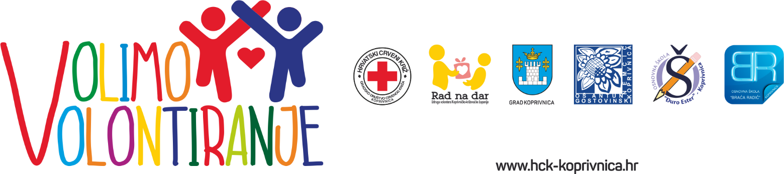 KOPRIVNICA- Gradsko društvo Crvenog križa Koprivnica u suradnji s partnerima Gradom Koprivnica, koprivničkim osnovnim školama ‘Đuro Ester’, ‘Braća Radić’ i ‘Antun Nemčić Gostovinski’ te Udrugom volontera Koprivničko – križevačke županije ‘Rad na dar’ provodi projekt ‘Volimo volontiranje’ financiranog iz Europskog socijalnog fonda (Operativni program ʹUčinkoviti ljudski potencijaliʹ 2014. – 2020).