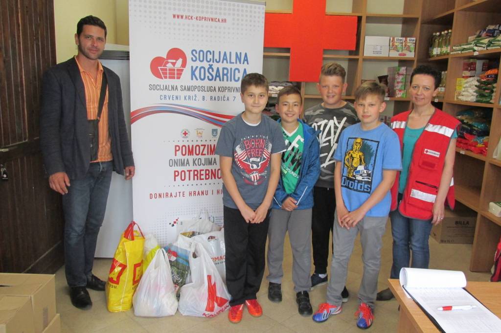 KOPRIVNICA- Učenici 5. b razreda Osnovne škole „Đuro Ester“ iz Koprivnice 7. lipnja 2017. godine donirali su prehrambene namirnice Gradskom društvu Crvenog križa Koprivnica za potrebe Socijalne samoposluge. Učitelj Darko Markić organizirao je prikupljanje donacija za Socijalnu samoposlugu, a učenici su i ovog puta pokazali svoju dobrotu i humanost. Učenici su donirali 39 kilograma prehrambenih namirnica: brašno, tjesteninu, ulje, šećer, rižu i sol. Zahvaljujemo vrijednim i dobrim učenicima na donacijama koje će biti podijeljene korisnicima Socijalne samoposluge.